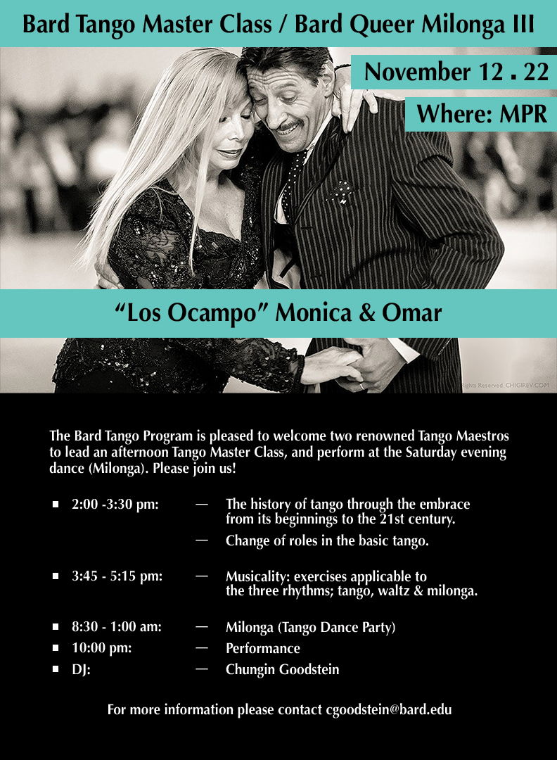 The Bard Tango Program is pleased to welcome Los Ocampo: Mónica Romero and Omar Ocampo's 30-year partnership of performing, teaching, and sharing Argentine tango and folklore around the world. Los Ocampo are masters of Argentine tango and Argentine folkloric dances, such as chacarera, zamba and malambo, and are official adjudicators at the international Tango Championships in Argentina. The Bard Tango Program pursues a space for freedom of expression, creativity, and human dignity within this art.2:00 pm – 5:15 pm EST/GMT-5